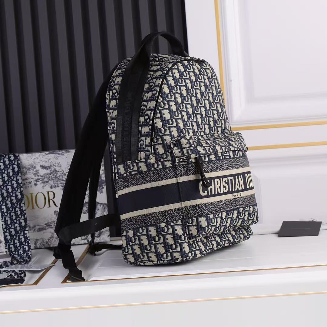 The Travel backpack in blue Oblique technical jacquard is a luxurious yet practical accessory that combines iconic design elements with modern functionality. It is designed to accommodate everyday essentials, including a 15-inch laptop, and features a prominent "CD Paris" signature on the front.