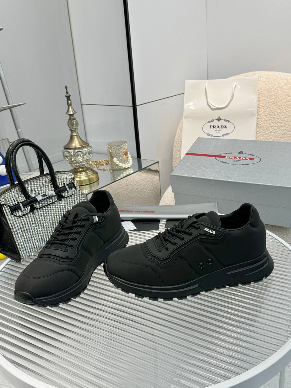 - The tongue includes a screen-printed Prada Milano lettering logo.
